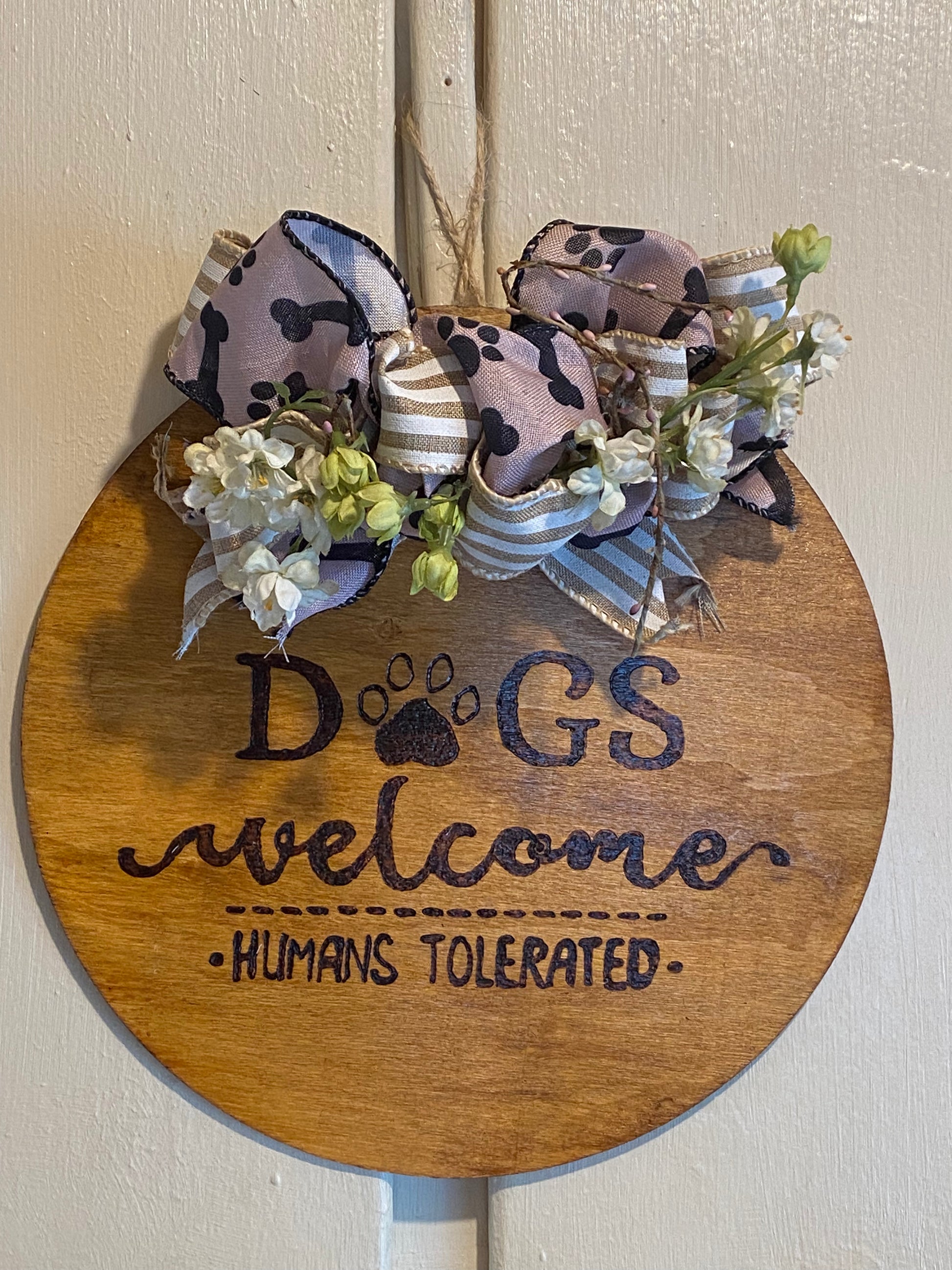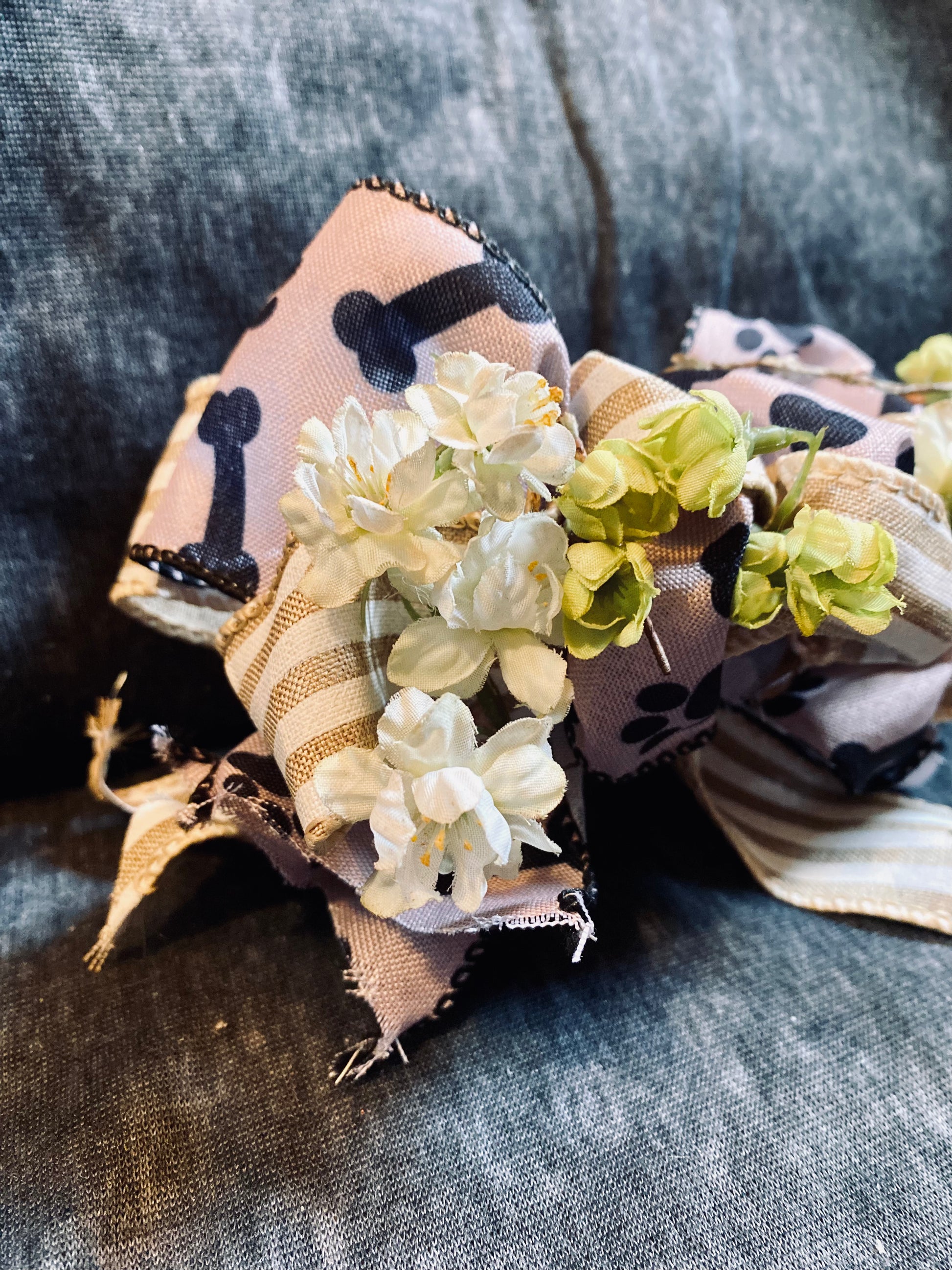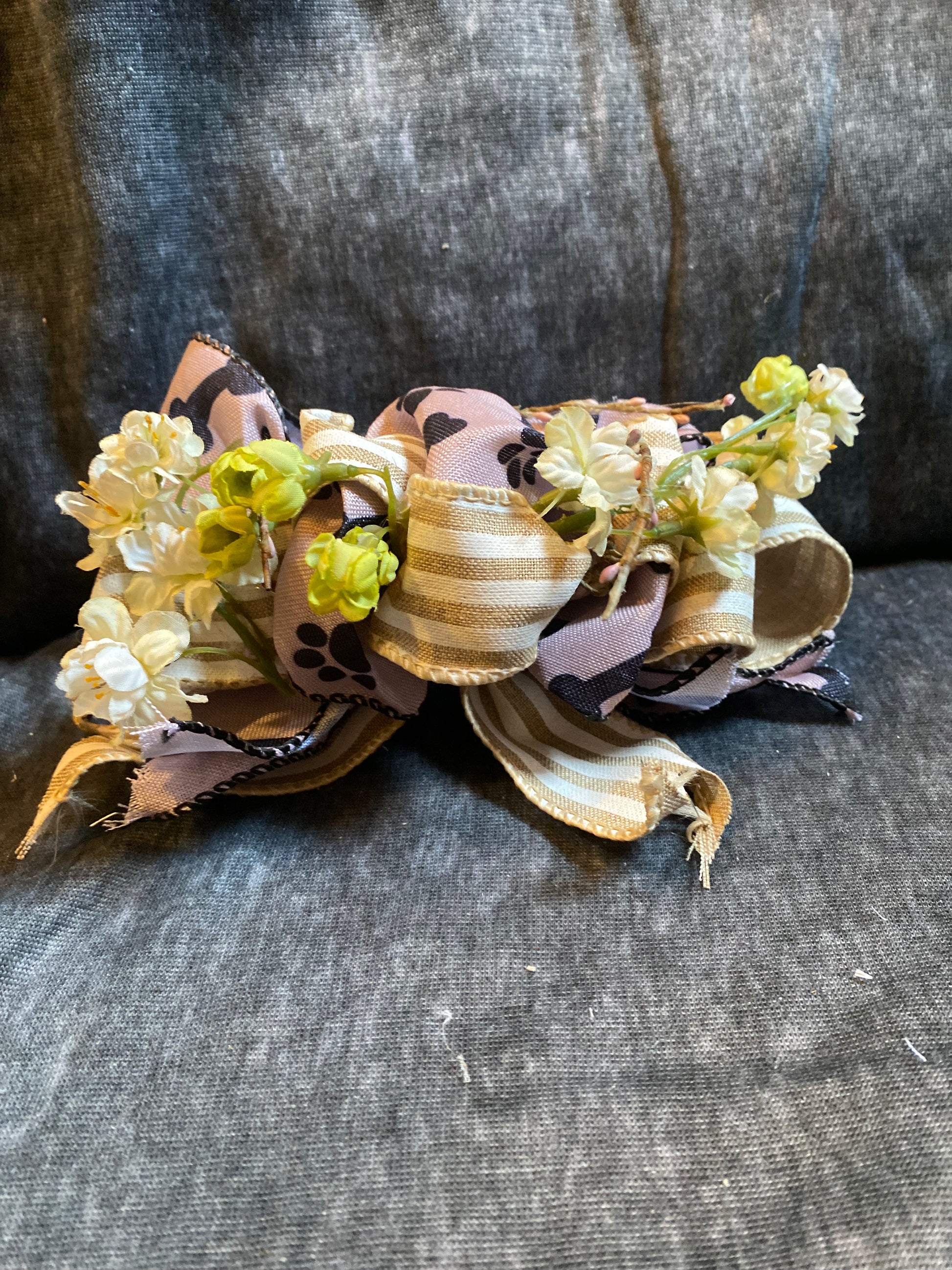Welcome to the paws-itively purr-fect world of Tan Paws n Stripes Lil bow. Let our combination of paw prints, cute subtle flowers, tan and white stripe ribbon, and a paw print ribbon make even your front door dress to impress! Show oFF your style with this stylish lil door hanger!